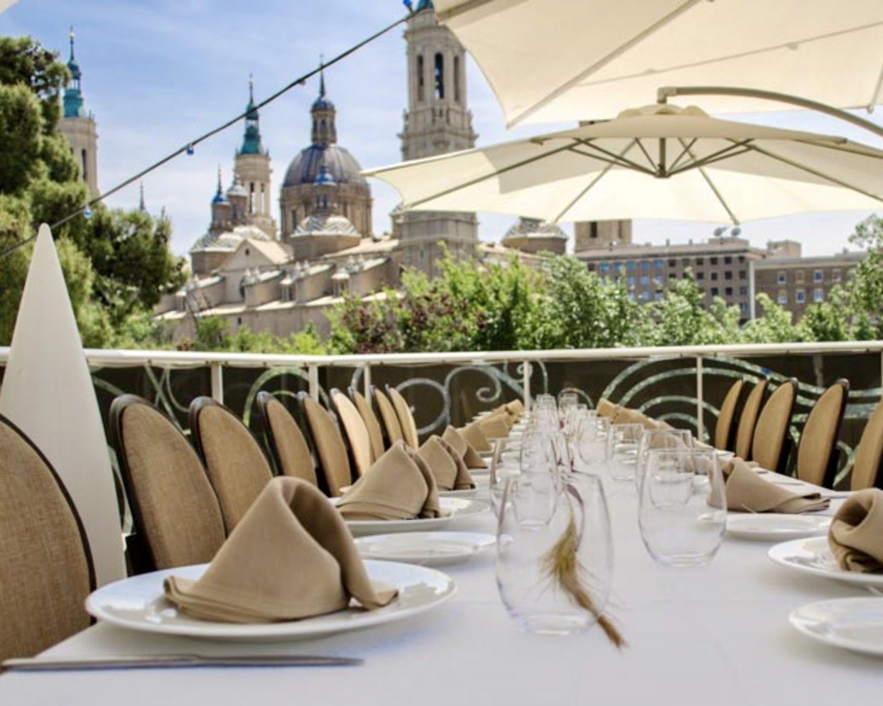 Si el tiempo acompaña, podrás disfrutar de una cena con una de las mejores vistas de la ciudad: El Pilar iluminado por la noche y el sonido del río Ebro de fondo.