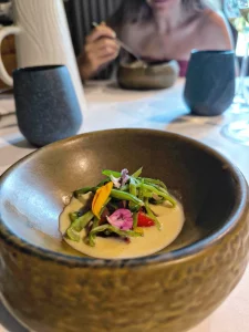 La experiencia gastronómica se desarrolla en distintos espacios, lo que permite vivir el restaurante de formas diferentes: desde la intimidad del propio vagón histórico, donde se disfruta del menú degustación en un entorno único, hasta otras zonas del complejo donde la propuesta se adapta a distintos momentos y tipos de comensal. El menú ofrece un auténtico viaje gastronómico que busca emocionar a través de sabores, texturas y productos representativos de Aragón, cuidando cada detalle tanto en cocina como en sala.