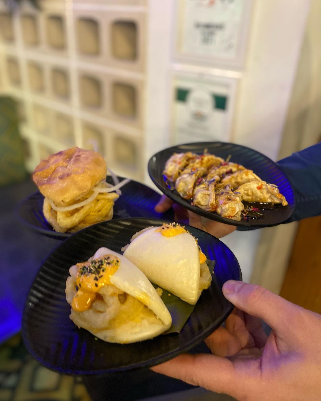 CACHOPO BURGER: Cachopo de ternera a los cuatro quesos, Jamón de Teruel DOP, escalibada aragonesa, tomate rosa, ketchup de ajo negro y mucho rollo.