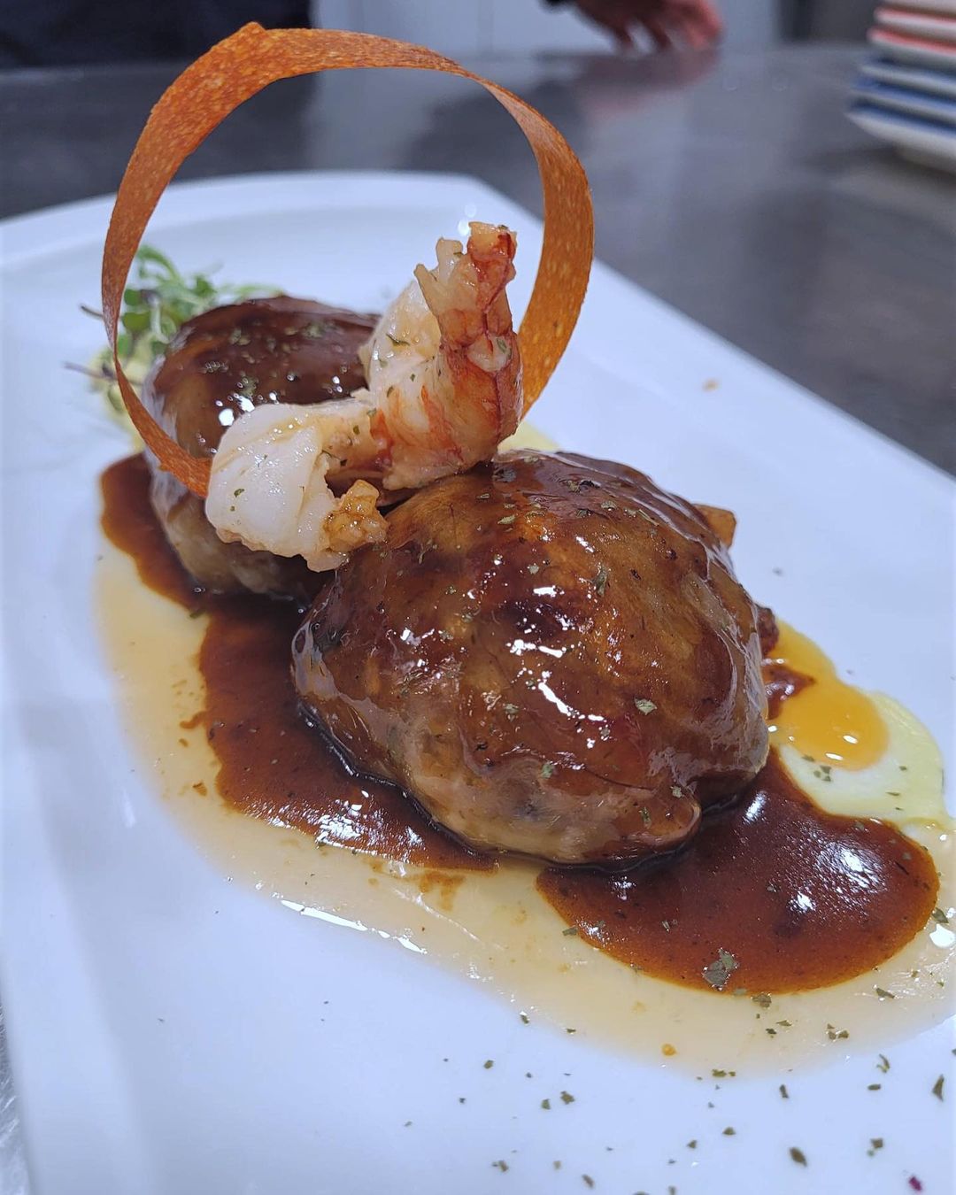 SAN JACOBIAN: Ternera, jamón serrano, sobrasada con miel y curry y queso radiquero.