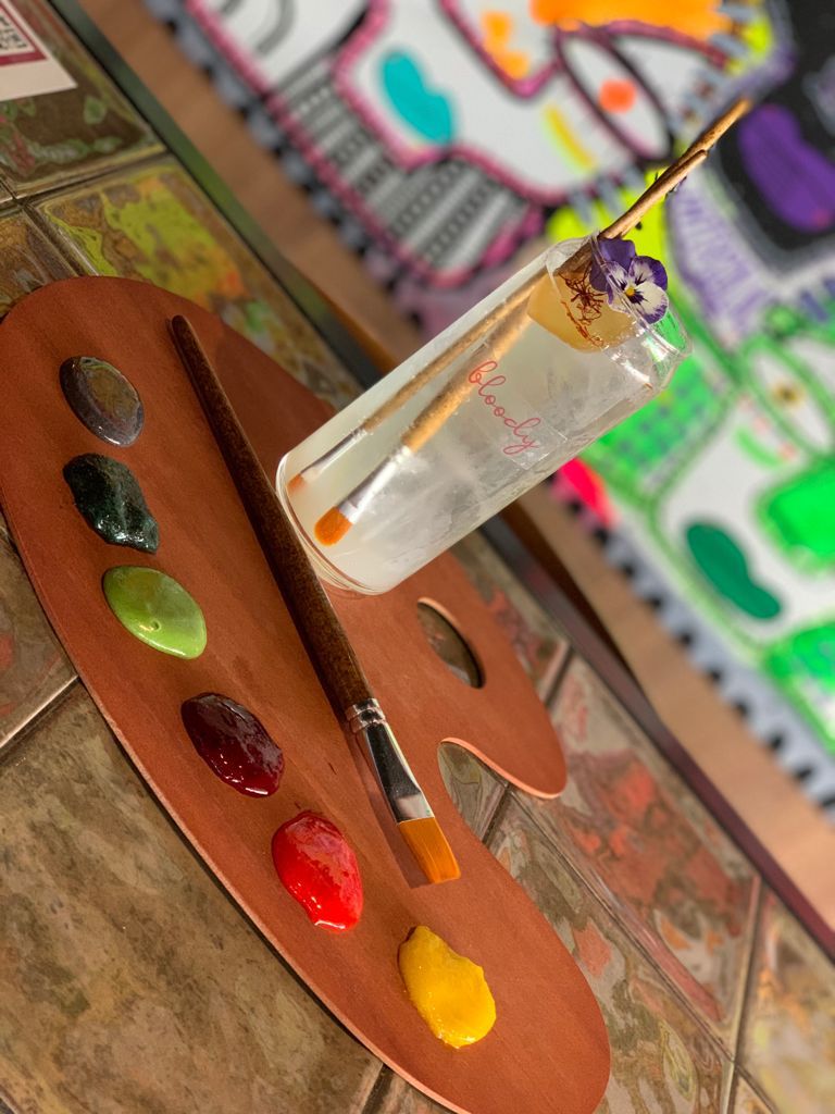 La Paleta del genio, creación de Sonia Díaz de Bloody nos sorprende con una puesta es escena sin igual. Los colores son siropes de sabores ( albahaca, bergamota, mora, yuzu, fresa, frambuesa). Un pincel que retoza en esos sabores para acabar limpiándolo en un agua que es en realidad es un cóctel.