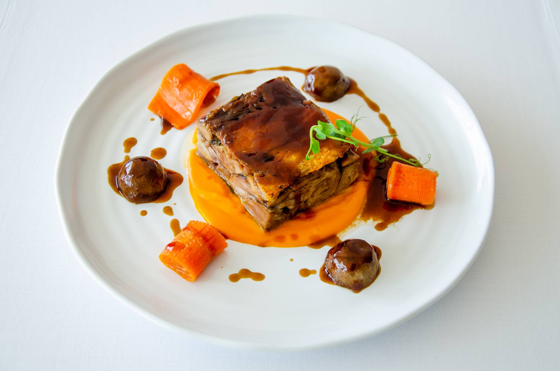 - El Mercao (Teruel): “Carrillón de Ternasco de Aragón asado con pastel de boniato y salsa de higos”.