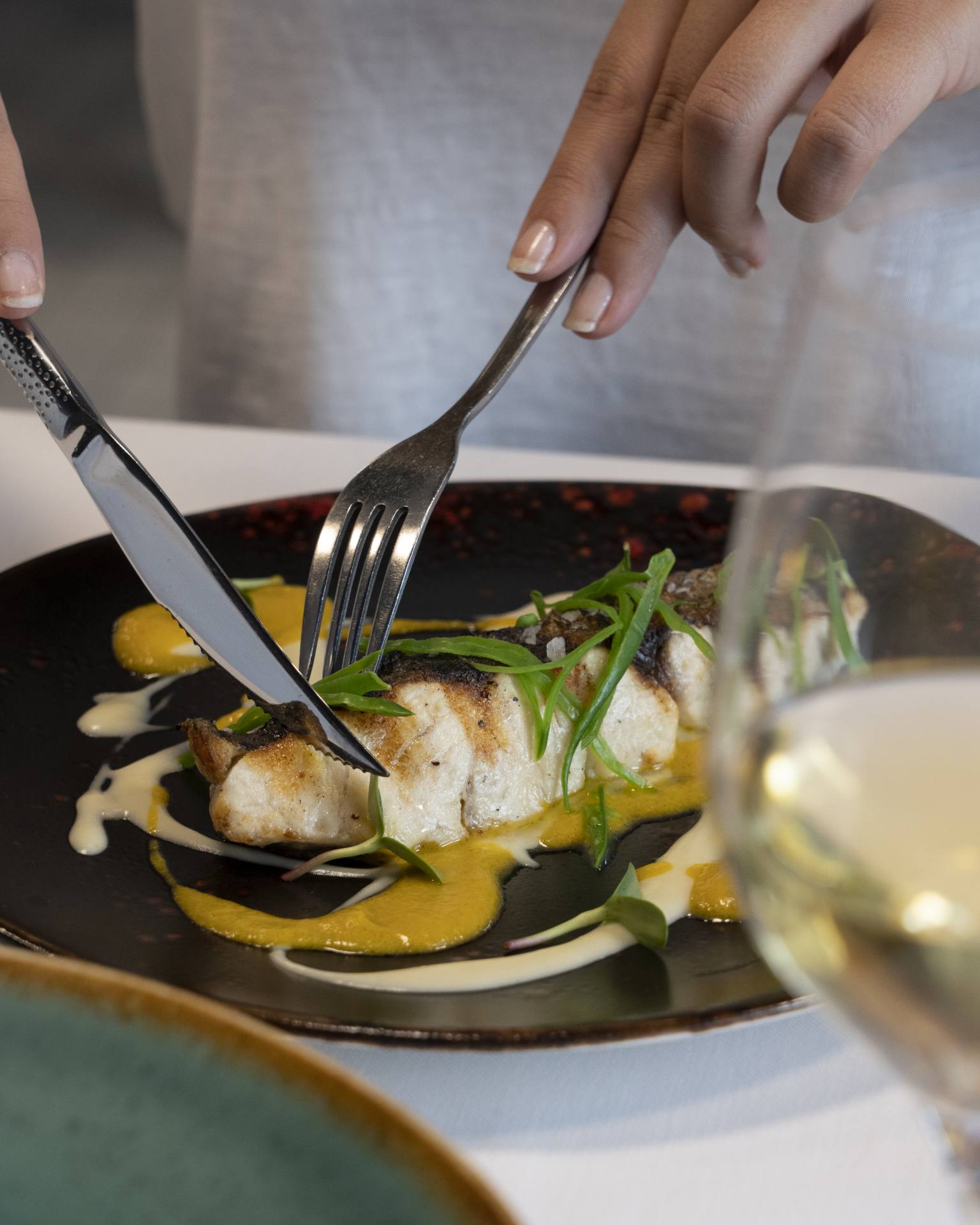 Canelón de gallina a la pepitoria, salsa de almendras, crema de azafrán y yema curada. Corvina a la brasa, causa limeña y escabeche de zanahoria.