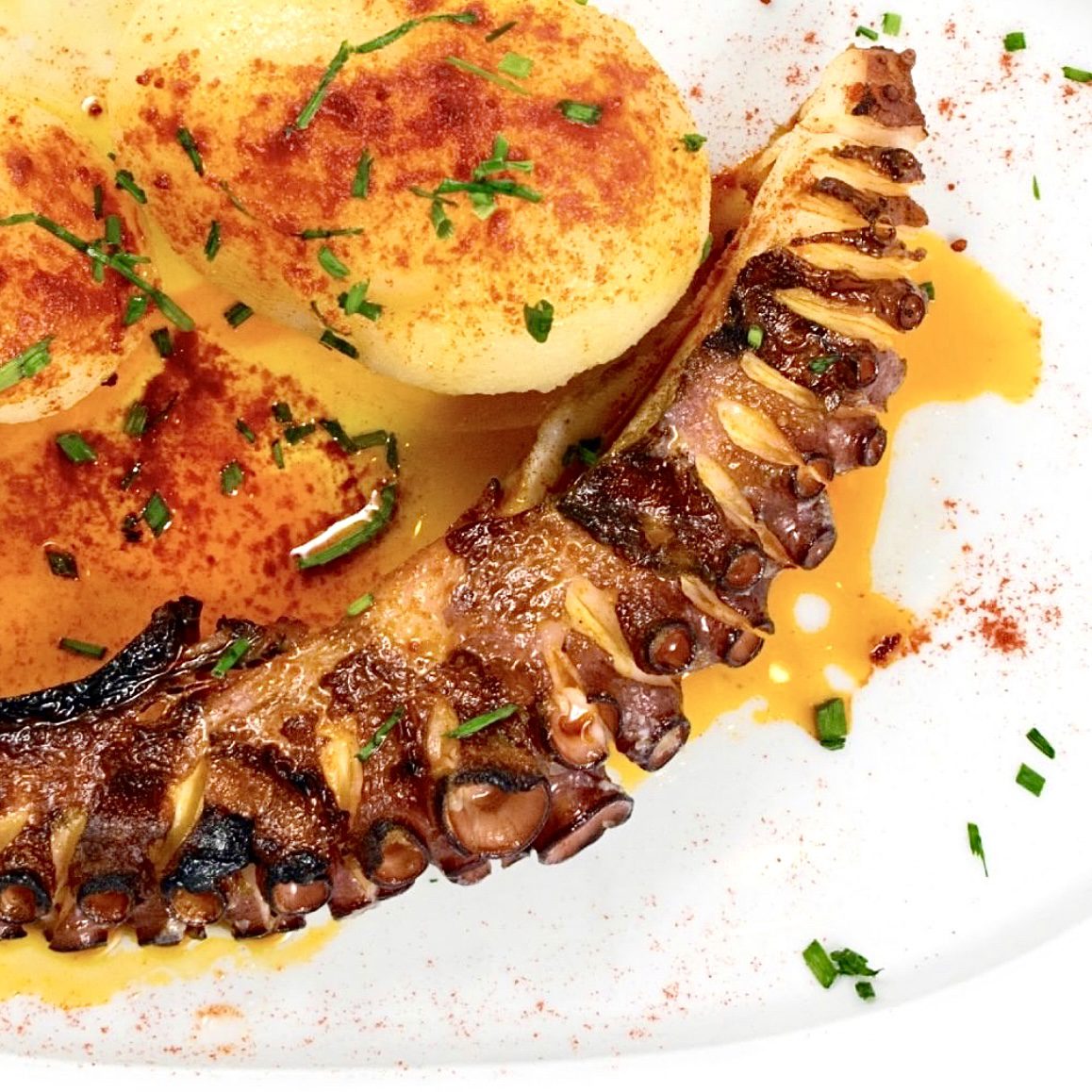 Además, la Taberna es famoso por el pulpo, plato estrella y el rey de la casa, y se encuentra en todas sus elaboraciones, “A Feira” como es tradicional comerlo en Galicia, a la brasa o en tortilla, es un plato típico para acompañar con pan gallego o los famosos “Cachelos” patatas cocidas con pimentón, aceite de oliva y sal.