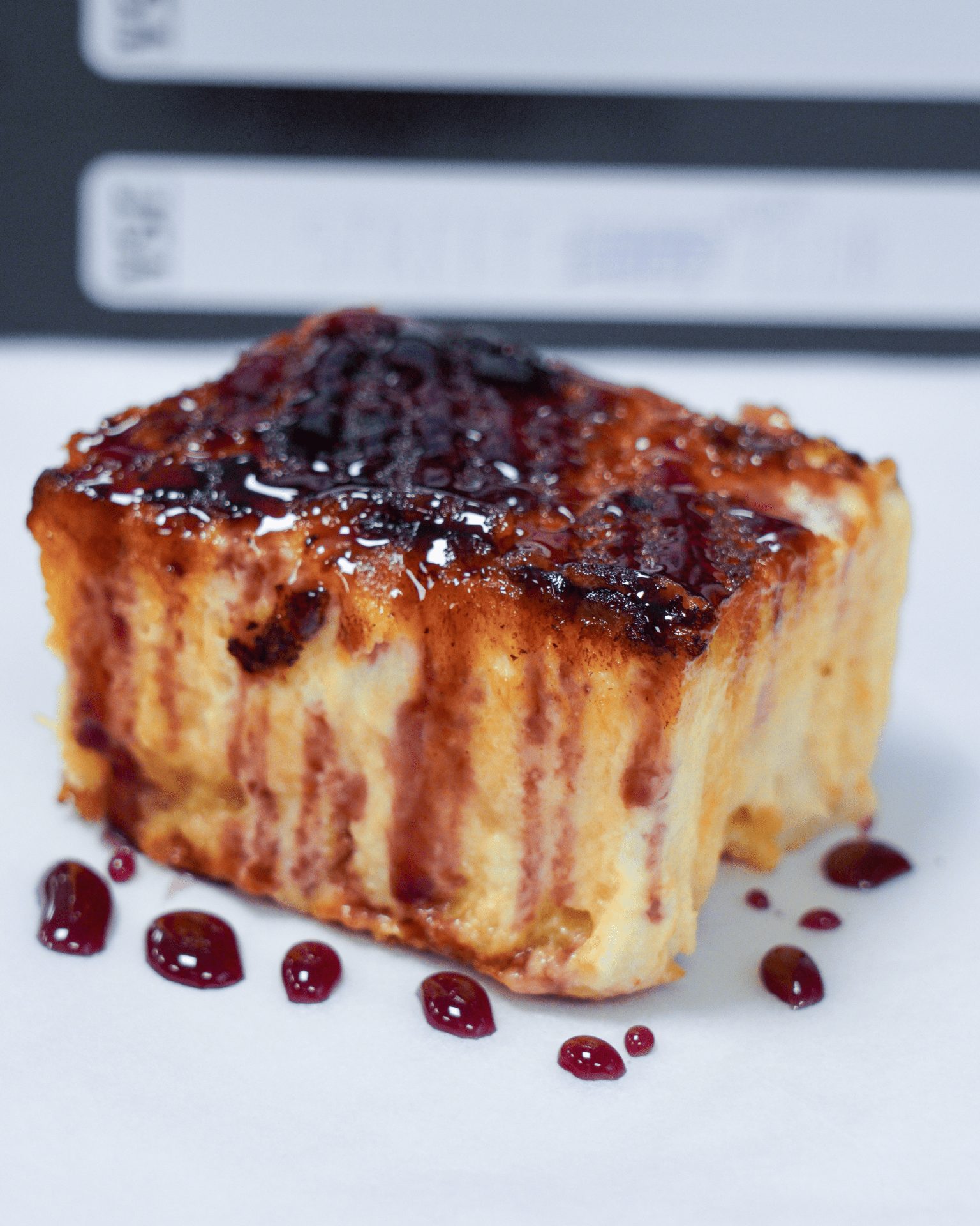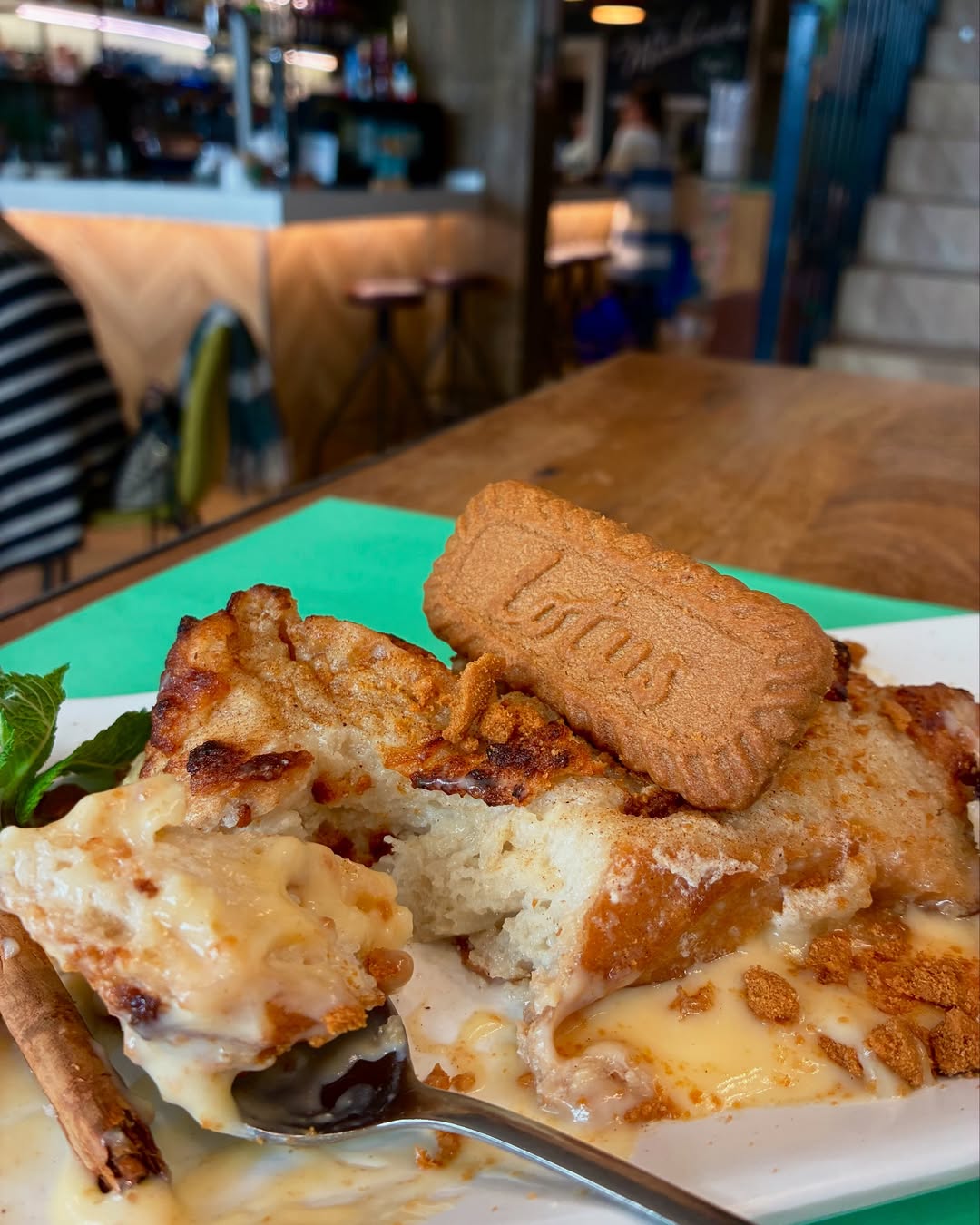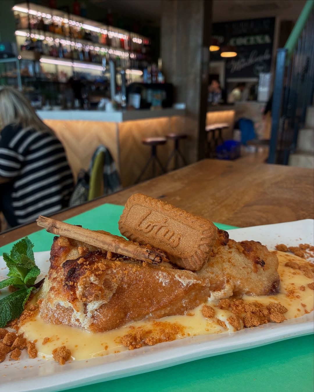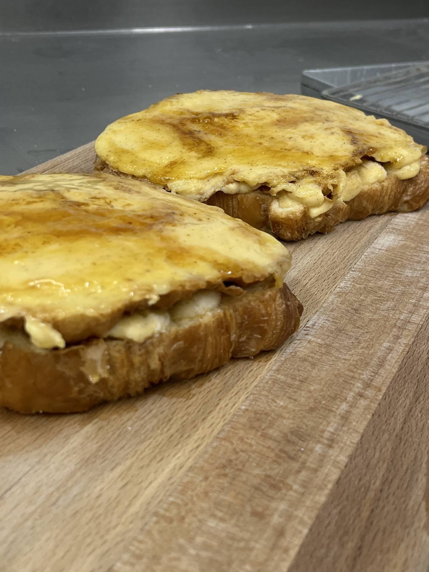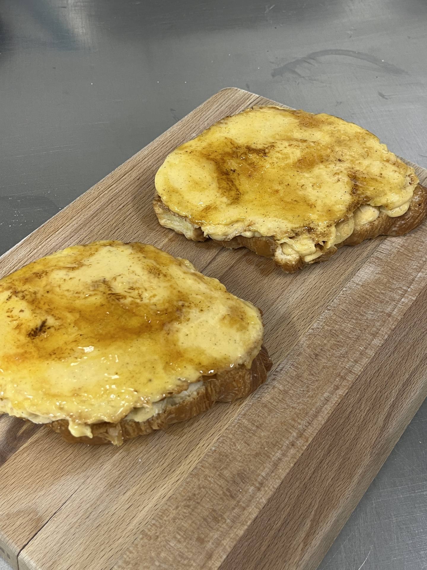 Elaborado con su croissant de mantequilla recién horneado, empapado en leche infusionada con vainilla y naranja, relleno y cubierto de crema pastelera casera y coronado con una capa de azúcar quemado que aporta ese crujiente irresistible.