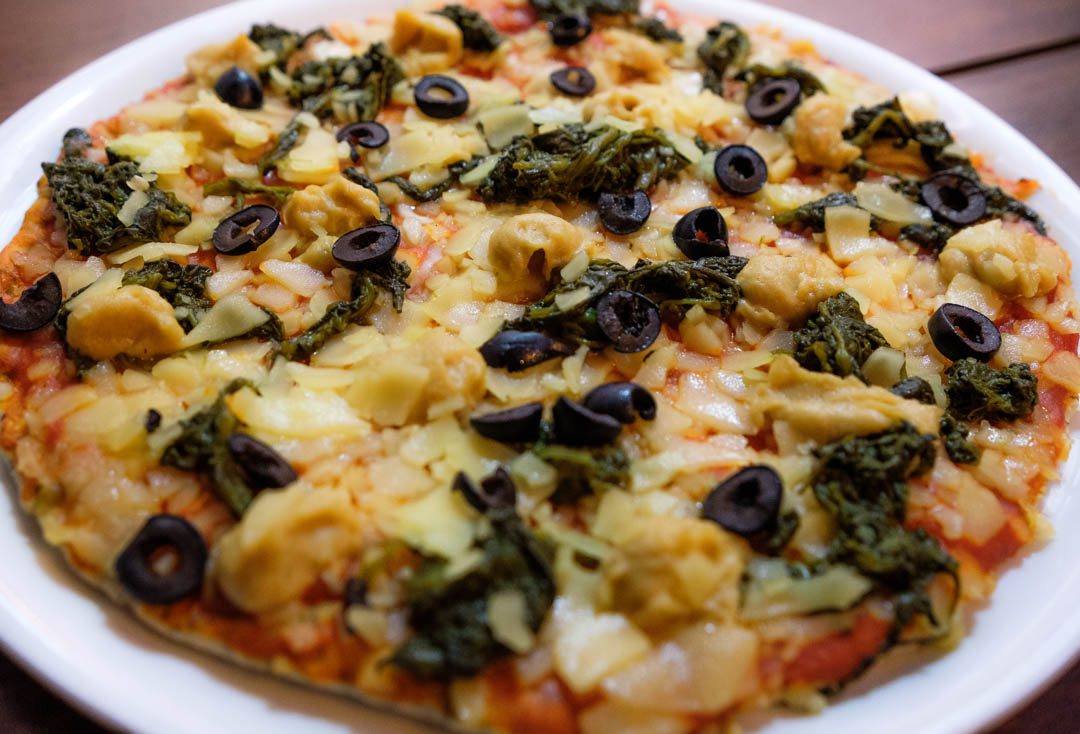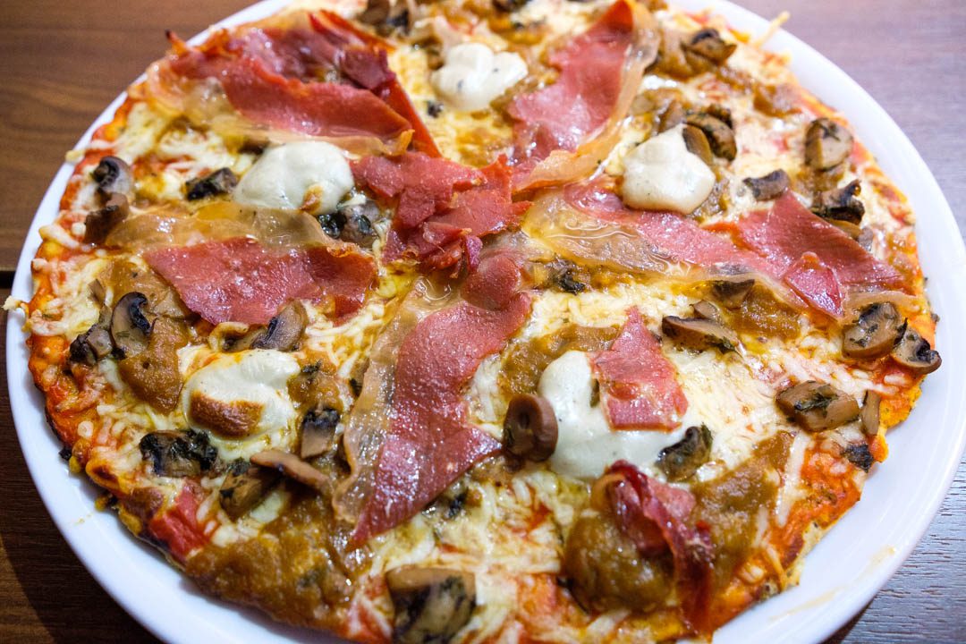Gramola: Pizza con pollo y tomates cherry macerados en jagermeister, con manzana verde, chorizo picante, bacon, cebolla caramelizada, sirope jager y salsa de la casa.